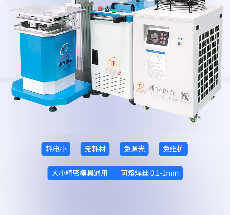 1、采用光纤激光器,反射率高,能量强,免维护,免调光,功耗少,相比传统 模具焊来说,体积小,安全,稳定性好超长使用寿命。